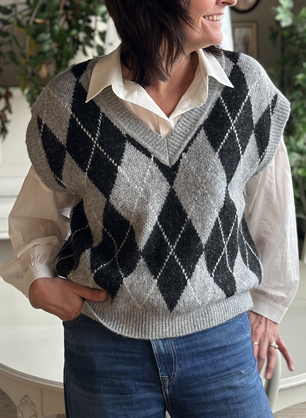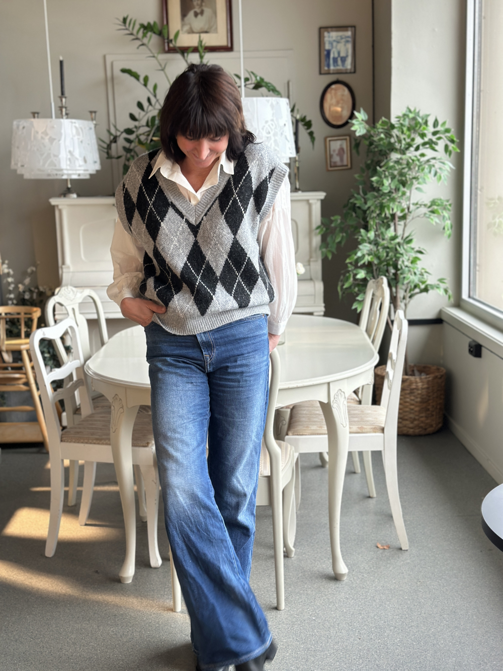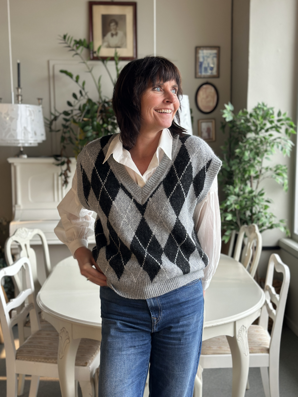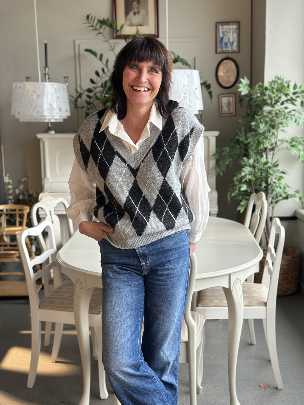Stilig vest fra Freequent i det populære Argyle - mønsteret. Vesten har v-utringning og faller litt ned på skuldrene. Den er i rett passform og rekker til hoftene. Like fin over skjorte som en pologenser. Vesten er i myk ullblanding med diskret lurextråder. Normal i størrelsen. Bente er 174 cm og har str. M.
