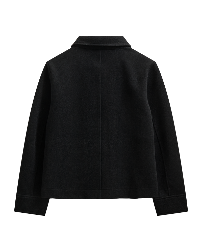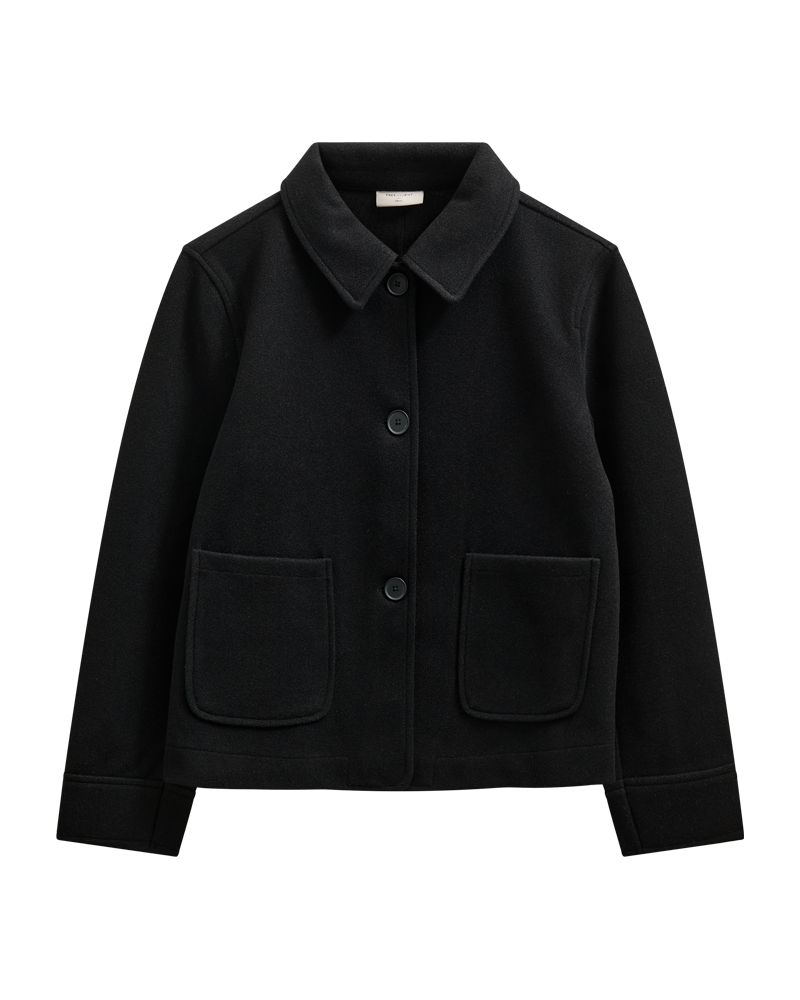 Uforet jakke fra Freequent i imitert ullkvalitet. Dette er en kort jakke med krage som lukkes med knapper foran. Den rekker til hoftene og har påsydde lommer foran. En fin sesongjakke som kan brukes både inne og ute. Normal i størrelsen.