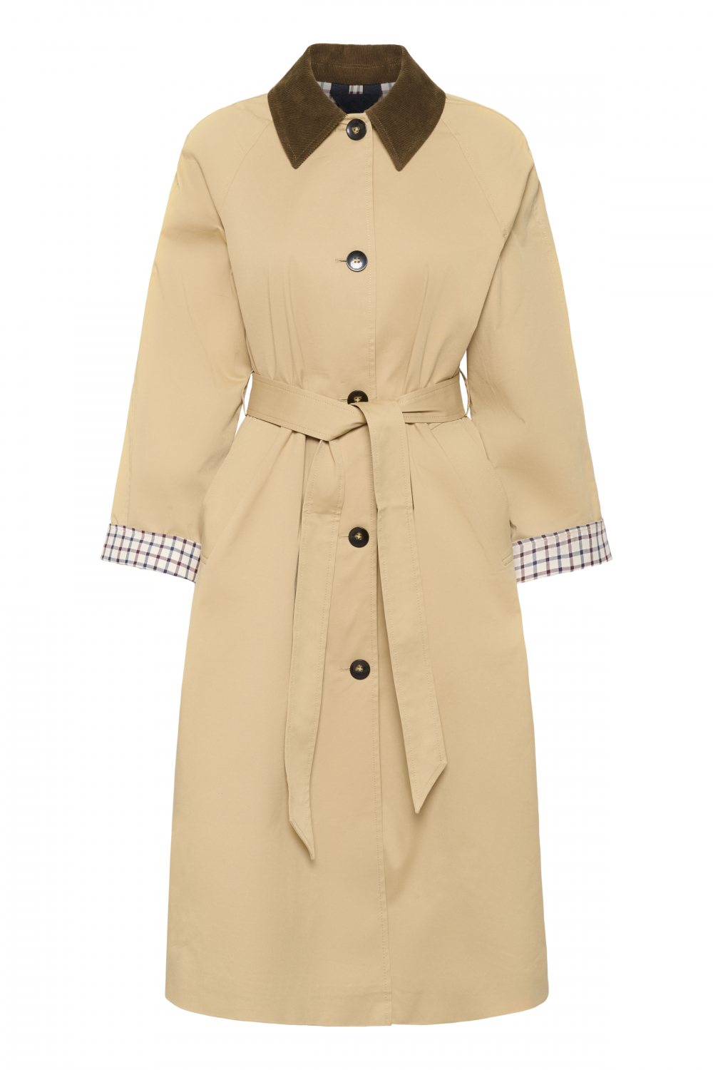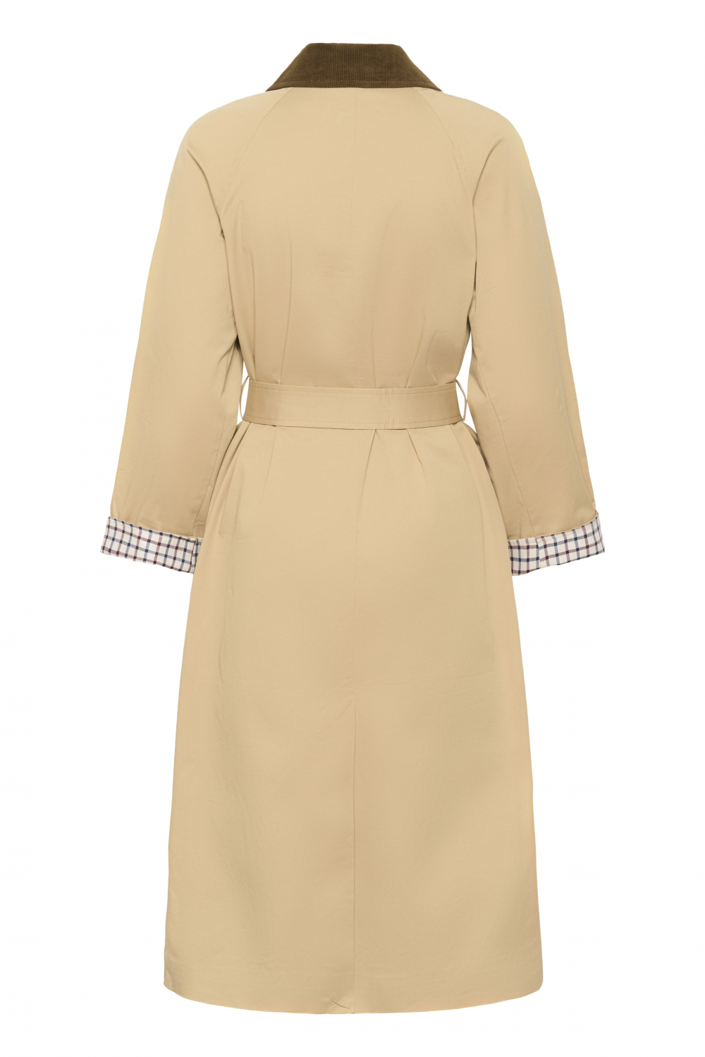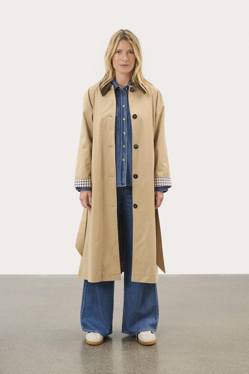 Lang trenchcoat fra Part Two med stilfulle detaljer. Kåpen har brun kontrastkrage i cordfløyel og det rutete fòret gir en fin kontrast på ermene hvis man ønsker det. Den har praktiske stikklommer i siden og lukkes med sorte knapper i front. Knytebelte i samme kvalitet som frakken følger med og gir et feminint snitt når den lukkes med belte. Normal i størrelsen.